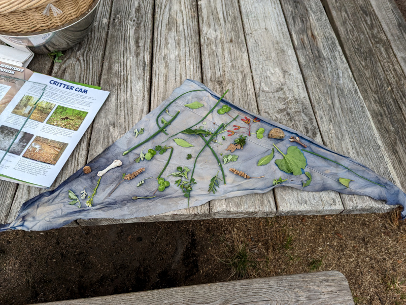 For cyanotypes, you put objects onto paper (or cloth!) that has a special light-sensitive chemical applied to it. Claire had collected these items from around the farm. The covered area behind the objects stays white, and the rest of your canvas exposes to blue (or "cyan") in sunlight. Work quickly, as it starts exposing right away!